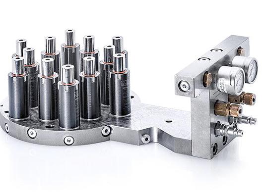 Pour les systèmes de tuyaux et de plaques, plusieurs ressorts à gaz et une armature de contrôle sont reliés entre eux par des tuyaux ou des trous dans une plaque en acier, conformément à la directive sur les équipements sous pression, afin de créer une pression système uniforme.